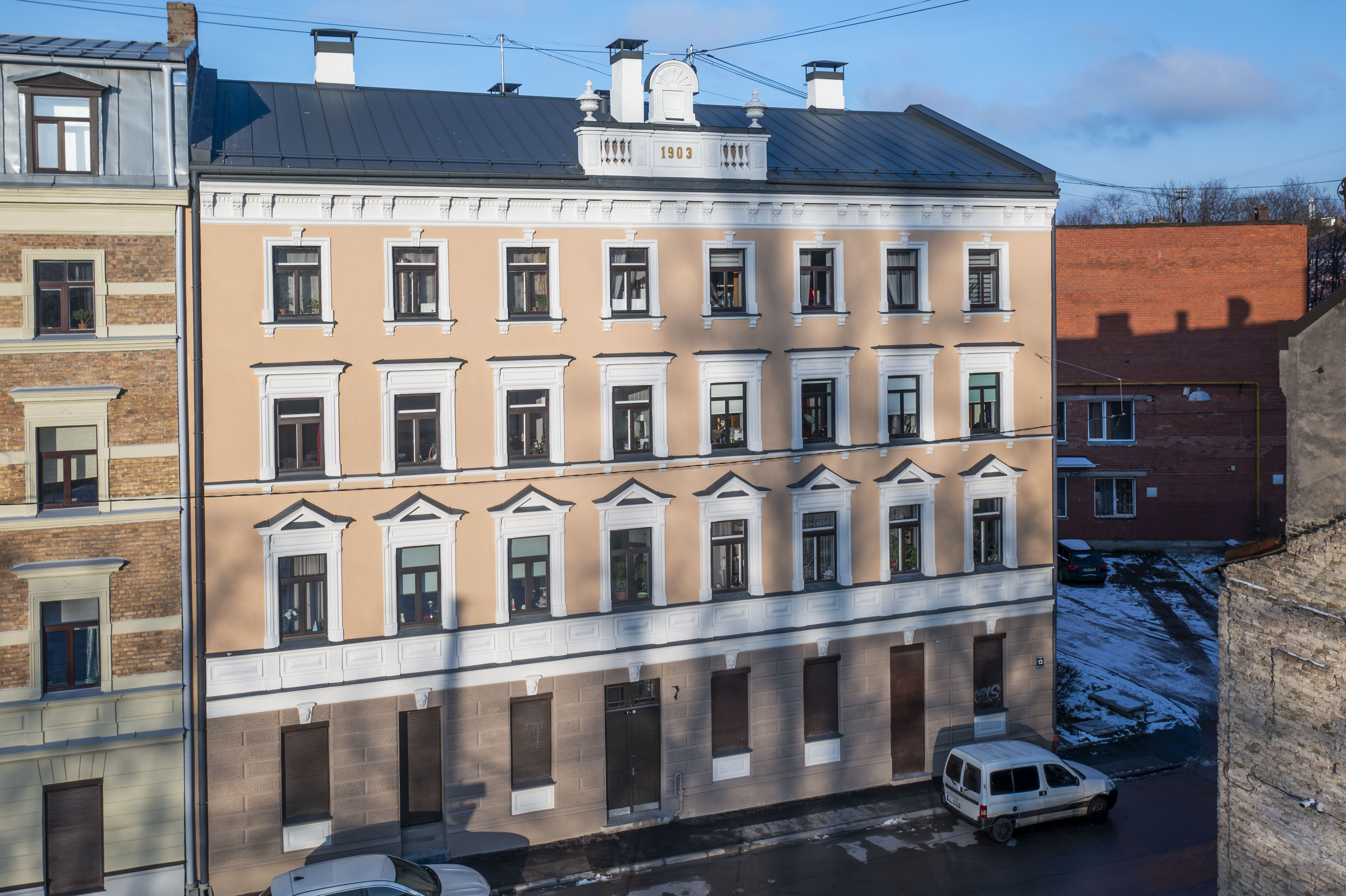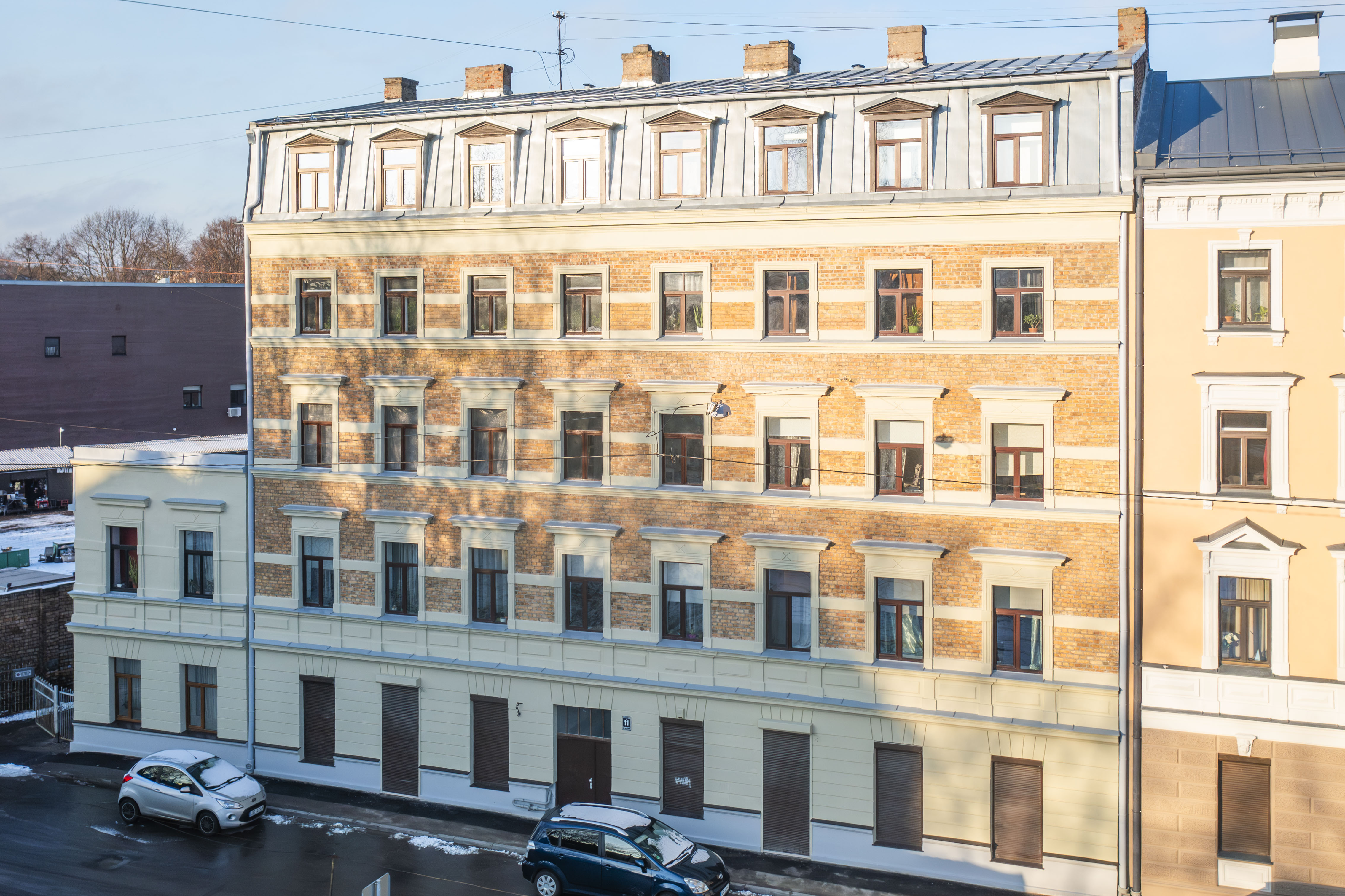 Brīvības ielas 64 ēka ar atjaunotu fasādi no drona lidojuma