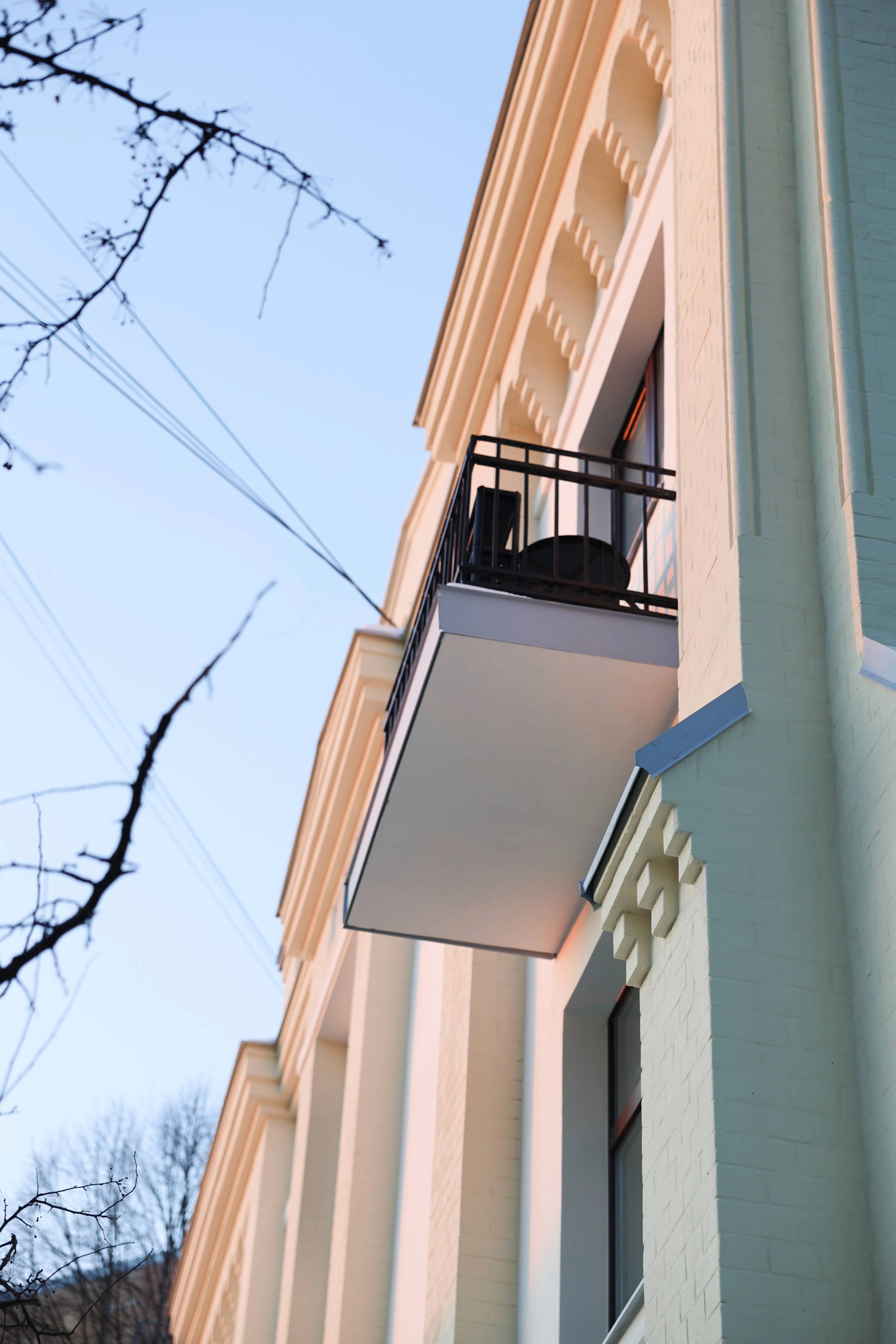Latgales ielas 57 ēkas atjaunotā fasāde, balkons tuvplānā 2026-03-23