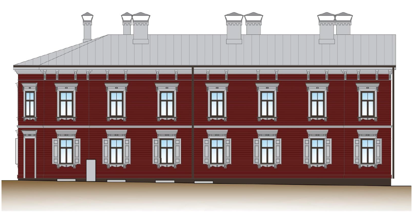 Fasādes atjaunošanas projekta ietvaros veikti sekojoši darbi: fasādes krāsošana, bojāto fasādes apdares dēļu labošana un nomaiņa, fasādes dekoratīvo elementu atjaunošana, logu palodžu un durvju atjaunošana, lāseņu virs dzegām un sandrikiem krāsošana, tekņu un noteku nomaiņa, cokola atjaunošana, apdares atjaunošana ar kaļķa javu, gaismas aku skārda vāku nomaiņa, jaunu dekoratīvo elementu izveide virs logiem iekšpagalma fasādē.